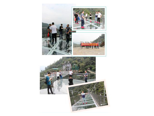 亲眼目睹,方鉴非凡,身临其境,方知震撼,打卡古龙峡的“云天玻霸”,要有“会当凌绝顶,一览众山小”的气势和决心。山路陡峭,登山不易,但是慧百自动化的每位成员互相帮助、相互扶持,一起跨过每一道险峻,处处体现着团结的力量。来到以72米的悬空跨度名列世界第一的U型云天玻霸,目前世界上最宽的高空玻璃桥,玻璃桥像一条通体透明的巨龙连接着峡谷两岸,桥下悬空超过100米,令人心惊胆战,正是考验团队成员胆识与默契的好机会。大家相互打气加油,相互关爱,给予成员更多的鼓励,全员成功抵达世界最大直径的悬空玻璃平台,满满的成就感......
