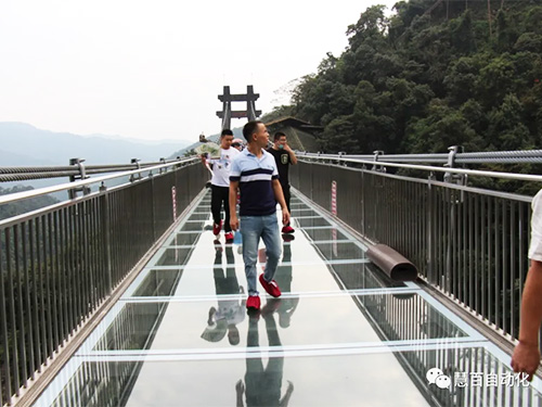 亲眼目睹,方鉴非凡,身临其境,方知震撼,打卡古龙峡的“云天玻霸”,要有“会当凌绝顶,一览众山小”的气势和决心。山路陡峭,登山不易,但是慧百自动化的每位成员互相帮助、相互扶持,一起跨过每一道险峻,处处体现着团结的力量。来到以72米的悬空跨度名列世界第一的U型云天玻霸,目前世界上最宽的高空玻璃桥,玻璃桥像一条通体透明的巨龙连接着峡谷两岸,桥下悬空超过100米,令人心惊胆战,正是考验团队成员胆识与默契的好机会。大家相互打气加油,相互关爱,给予成员更多的鼓励,全员成功抵达世界最大直径的悬空玻璃平台,满满的成就感......