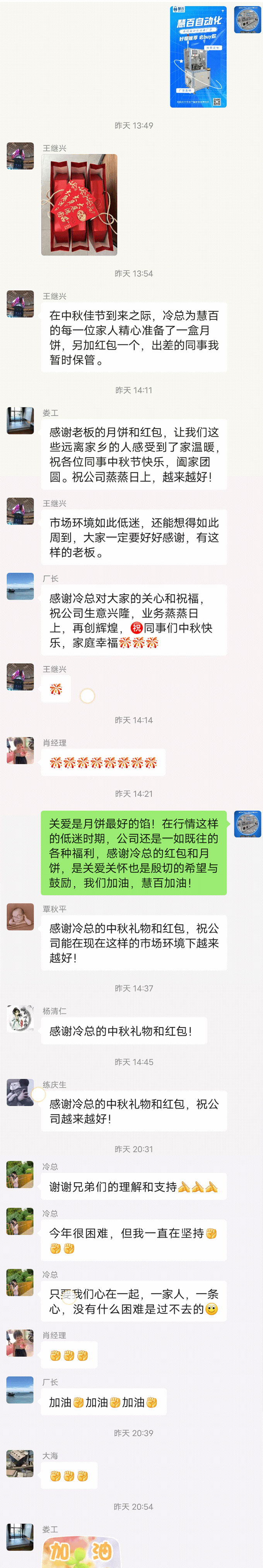 情暖中秋,爱在慧百 花好月圆,情暖中秋 明月传情,爱在慧百 值此2022年中秋佳节来临之际 慧百自动化又为员工精心准备的中秋福利 也如约而至啦! 东莞市慧百自动化有限公司是一家对员工真正做到了得人心、暖人心、聚人心的企业,一直以来都以实际行动彰显对员工的关爱,传递对员工的重视,打造令员工充满自豪感、幸福感和归属感的文化氛围,让我们每一位慧百家人都能体会到家的温暖! 慧百自动化又发福利啦! 中秋未到 月未圆 礼先至 情暖中秋 心系员工 爱在慧百 一个个真心实意的现金红包 一盒盒精心挑选,甜而不腻的月饼 一份份朴实无华的祝福 不止于行,不止于礼, 也是我司冷总对所有员工爱意的传达及用实际行动诠释对员工的关怀! 暖心的福利,浓缩的是冷总对所有员工暖暖的温情...... 不管是对客户还是合作商我们的冷总一直都很用心,员工也不例外,所有关于我们员工的事(福利、成长、学习……)也都装在他的心里! 慧百自动化也一直在用实力证明,“自己从来不靠外表的美丽征服员工的心”,! 有爱既是圆满 小饼如嚼月,中有酥与饴” 天上的中秋是月圆 桌上的团圆是月饼 月饼节快乐吖~ 天上月圆圆 世间事圆圆 心中事圆圆 天遂人意,舒心开怀 中秋佳节,阖家团圆 愿所有的慧百家人们花好月圆~ 关爱是月饼最好的馅 以慧百为光 点亮明天的星辰 ...... 中秋佳节 花好月圆 Mid-autumn Festival