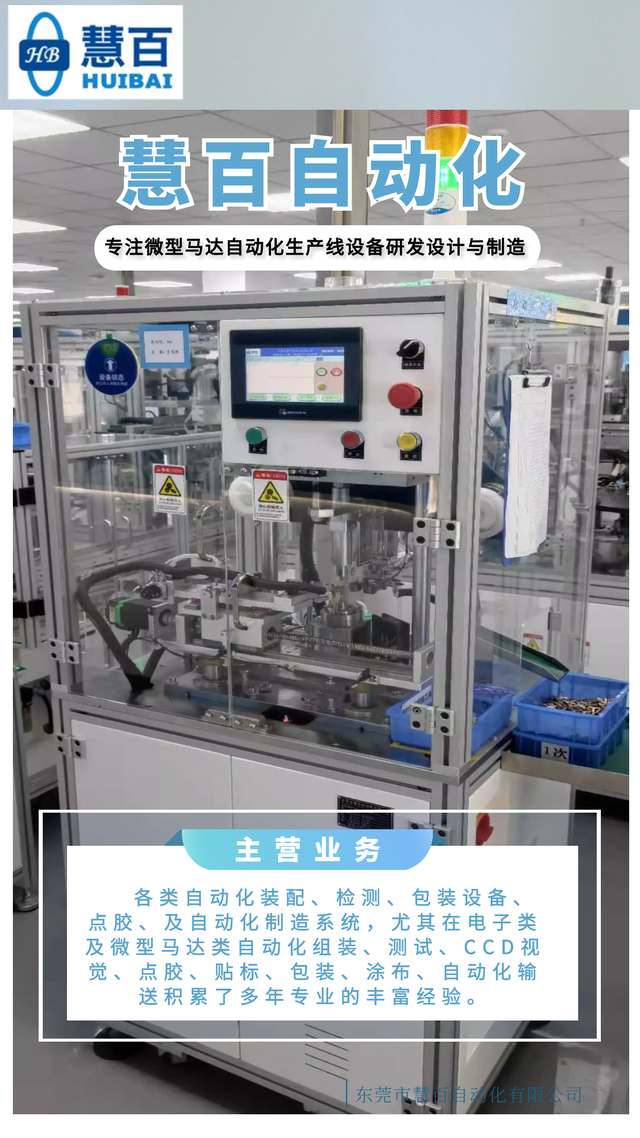 公司主要产品:各类自动化装配、检测、包装设备、点胶以及自动化制造系统,尤其在电子类及微型马达类自动化生产线组装、测试、CCD视觉、点胶、贴标、包装、涂布、自动化输送积累了多年专业的丰富经验。慧百自动化将坚持不懈地为非标自动化设备的研发和制造提供最先进的技术。