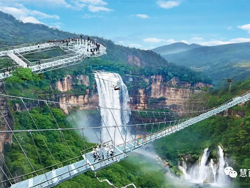 亲眼目睹,方鉴非凡,身临其境,方知震撼,打卡古龙峡的“云天玻霸”,要有“会当凌绝顶,一览众山小”的气势和决心。山路陡峭,登山不易,但是慧百自动化的每位成员互相帮助、相互扶持,一起跨过每一道险峻,处处体现着团结的力量。来到以72米的悬空跨度名列世界第一的U型云天玻霸,目前世界上最宽的高空玻璃桥,玻璃桥像一条通体透明的巨龙连接着峡谷两岸,桥下悬空超过100米,令人心惊胆战,正是考验团队成员胆识与默契的好机会。大家相互打气加油,相互关爱,给予成员更多的鼓励,全员成功抵达世界最大直径的悬空玻璃平台,满满的成就感......
